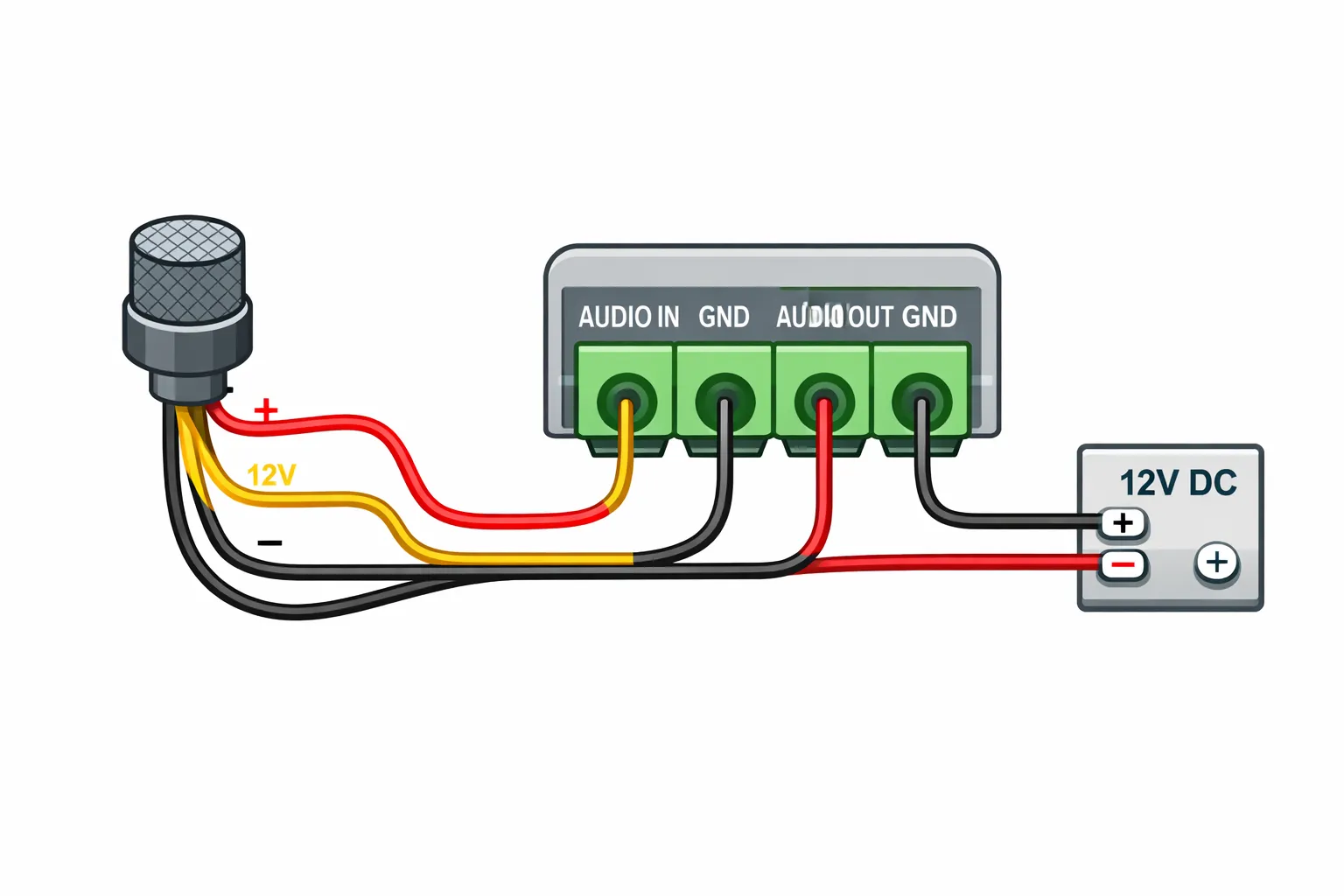 - На стороне кабеля (обычно это два провода: сигнальный и заземления): Сигнальный провод — подключается к сигнальному проводу микрофона. Заземляющий провод — подключается к отрицательному проводу микрофона и к отрицательному полюсу блока питания.