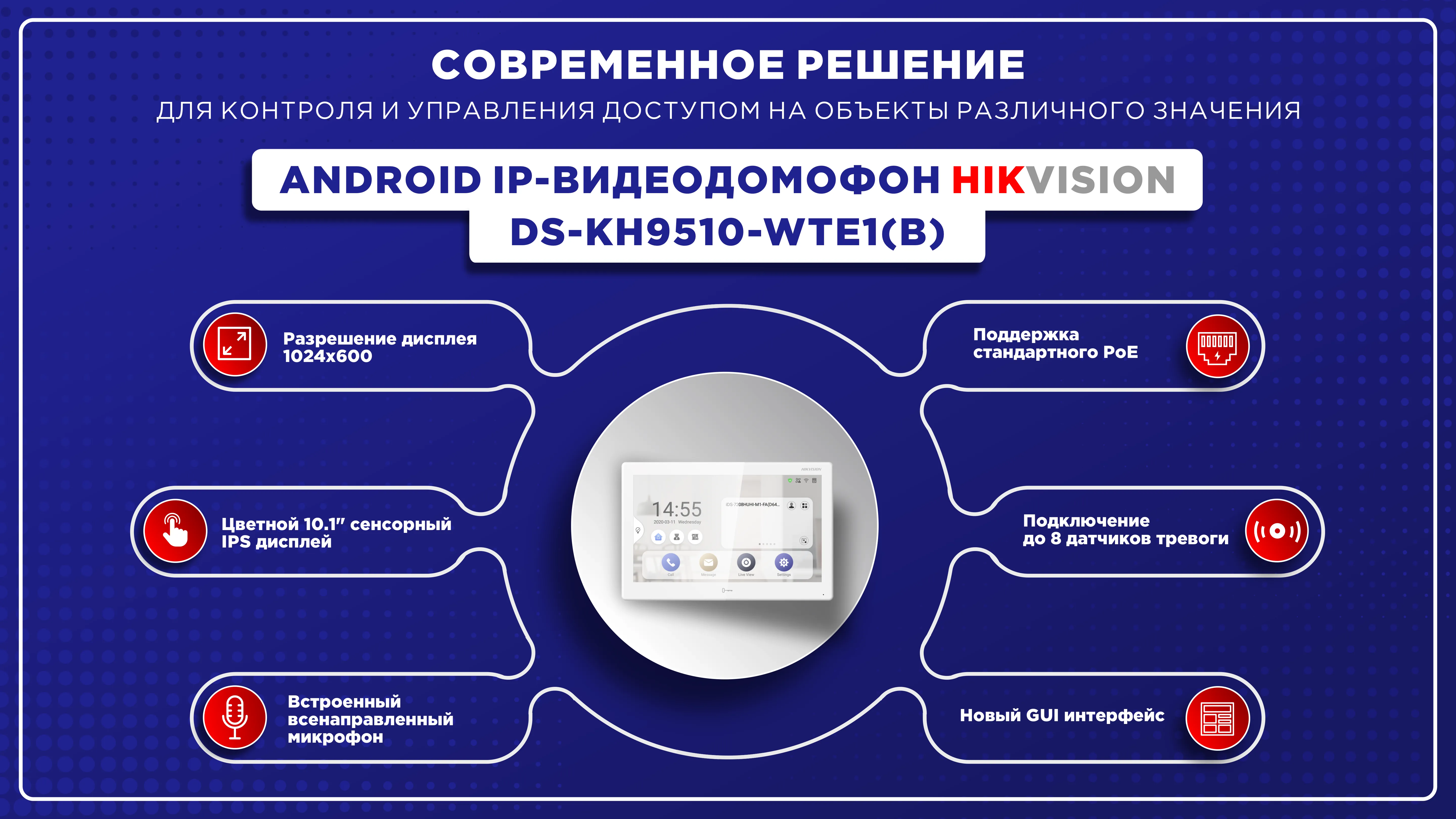 DS-KH9510-WTE1 – IP Видеодомофон на операционной системе Android. Монитор домофонной системы с IPS сенсорным экраном 10.1 дюймов. Разрешение дисплея: 1024 * 600. RJ45 10/100 Мб/с Ethernet, Wi-Fi: IEEE802.11b/g/n, стандартное PoE / 12 В пост. 8 тревожных входов, два тревожных выхода, RS-485. Встроенный Hik-Connect для комплексного управления. Поддерживает установку до 3-х приложений Android. Встроенный всенаправленный микрофон; 8Гб внутренней памяти; Рабочая температура -10° ~ +50° С.