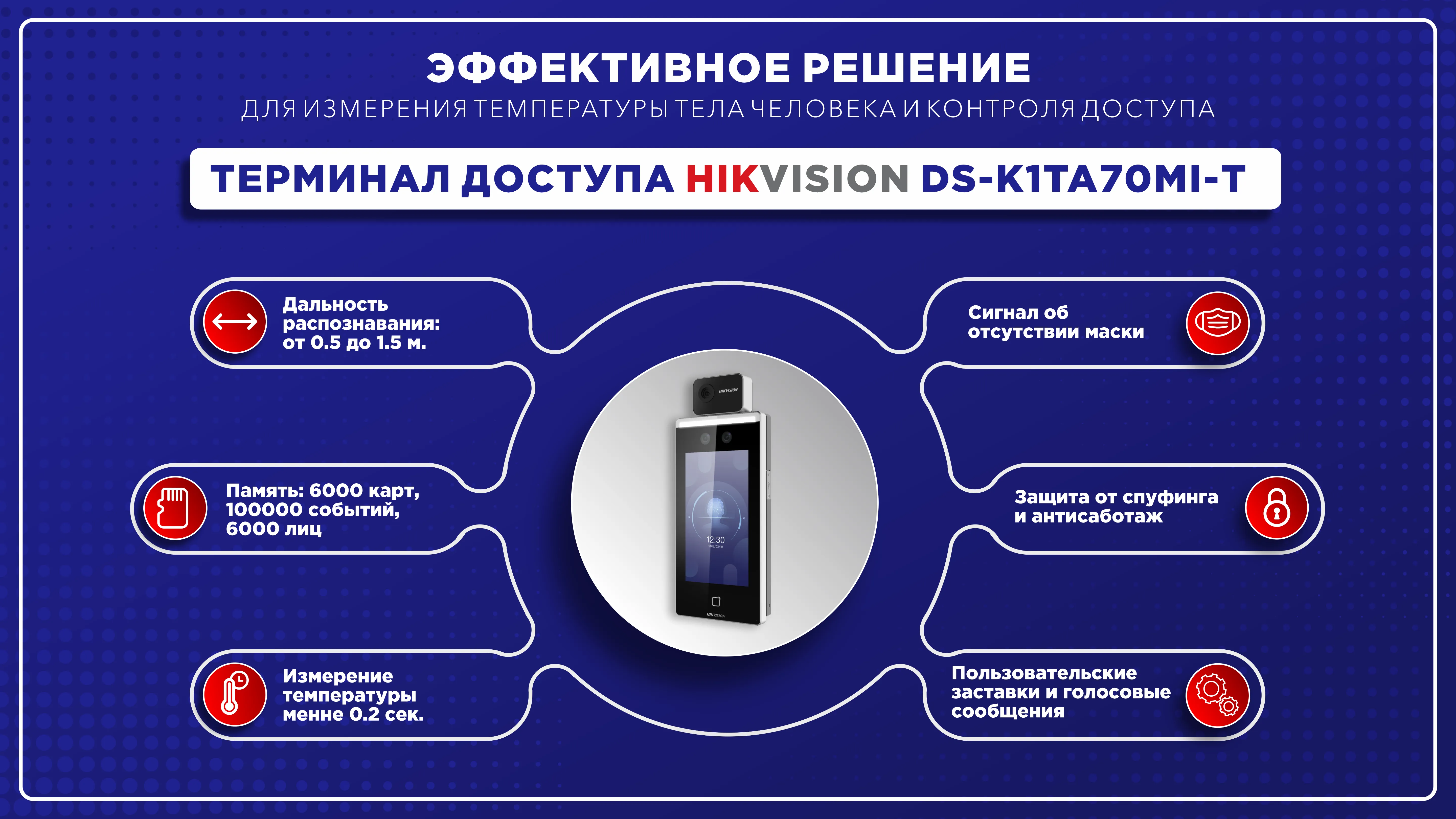 Терминал доступа с функциями распознавания лиц и измерения температуры тела человека. Операционная система Linux. Алгоритм глубокого обучения. 7-дюймовый сенсорный ЖК-экран, соотношение: 16х9, разрешение: 1024p×600p. Камера 2 МП,WDR, Широкоугольный объектив. Хранение до 6000 лиц, до 6000 карт, 100000 событий. Карты Mifare. Методы проверки: поддержка быстрого измерения температуры и распознавания лиц / карт с помощью диагностики лихорадки. Расстояние аутентификации: 0,3-2 м. Температурный диапазон: 30-45 ℃, точность: ± 0,5 ℃. Поддерживает 6 статусов посещаемости, включая регистрацию, выезд, взлом, выход из работы, сверхурочную работу, сверхурочную работу. Продолжительность распознавания лица (1: N) ≤0,2 с. Обнаружение маски: Поддержка предупреждения о ношении маски для лица и принудительного ношения маски. Без источника питания.