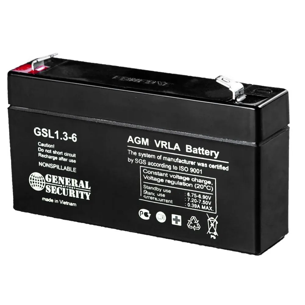 Аккумуляторная батарея 6В 1,3 Ач. Технология AGM Срок службы в буферном режиме, лет 3 Стандартный форм-фактор АКБ 6v 1.2-1.5ah 97x24x52 Клеммы F1 (faston) 4.8mm Габариты: Длина 97 мм; Ширина 24 мм; Высота без учета клемм 52 мм; Высота с учетом клемм 57 мм. Вес 0.25 кг Напряжение заряда АКБ, В 7.2-7.5 Напряжение подзаряда в буферном режиме, В 6.75-6.90 Номинальный - максимальный ток заряда, А 0.13 — 0.39 Диапазон рабочей температуры при заряде АКБ от 0°С до +40°С Срок службы в циклическом режиме, кол-во заряд/разряд до 260 циклов Нижний предел рабочей температуры при разряде, -15С Верхний предел рабочей температуры при разряде, +50С Материал корпуса АКБ ABS (акрило-бутадиен-стирол)