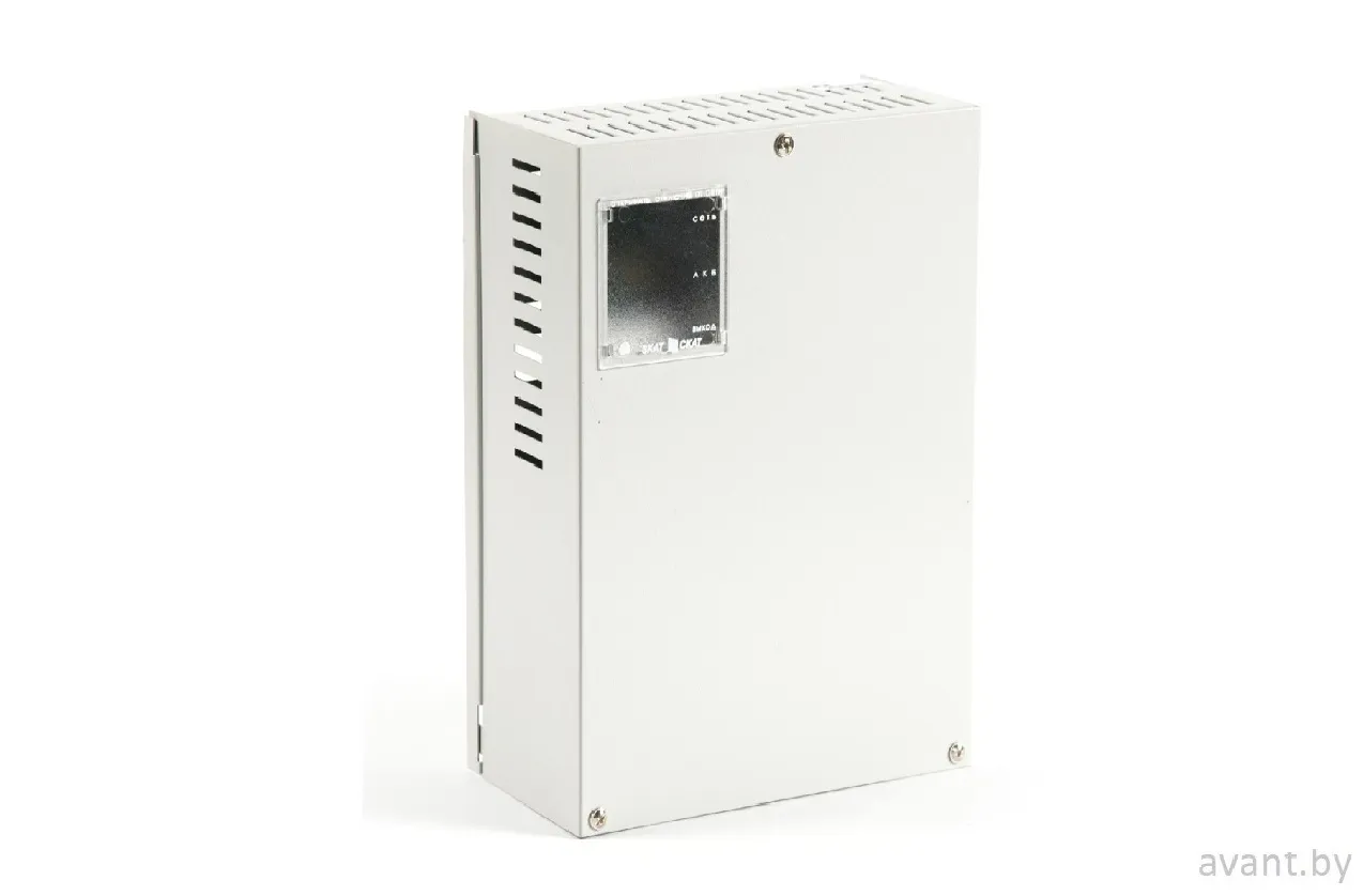 Резервированный источник питания, входное напряжение 170...250 В, выходное напряжение 12,9...14 В, номинальный ток нагрузки 4 А, максимальный ток нагрузки 5 А (до 5 сек), под два аккумулятора 12 В 7(12) Ач или один аккумулятор 12 В 17 Ач, световая индикация режимов работы, диагностические выходы типа "открытый коллектор", защита от короткого замыкания, защита аккумулятора от глубокого разряда, диапазон рабочих температур -10...+40°С, габаритные размеры 228х284х119 мм