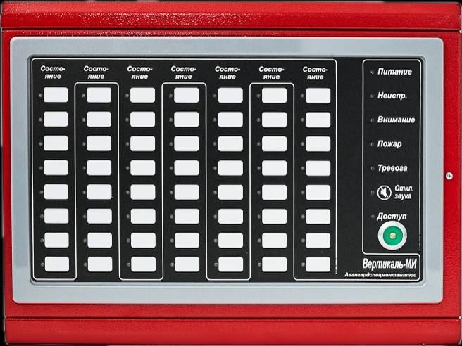 Модуль индикации выносной «Вертикаль-МИ» прибора приемно-контрольного пожарного и управления «Вертикаль» предназначен для работы в составе комплекта оборудования системы противодымной защиты ППКПУ «Вертикаль» и системы адресной пожарной сигнализации ППКП «Вертикаль-АСПС». Устройство работает в диапазоне напряжений питания 18-28 В по основному и резервному вводам, потребляя ток не более 20 мА в дежурном режиме и 60 мА в режиме «Пожар». Связь с элементами системы осуществляется по интерфейсу RS-485. Время технической готовности модуля к работе не превышает 60 секунд. Модуль поддерживает установку 7 панелей индикации (ПИ) и панелей контроля и индикации (ПКИ). Каждая ПИ оснащена 8 индикаторами, а ПКИ — 8 кнопками и 8 индикаторами. Каждый индикатор отображает 9 состояний с использованием трех цветов (зеленый, желтый, красный) и трех режимов работы каждого цвета (постоянное свечение, короткие и длинные пульсации). Модуль имеет 7 общих индикаторов: «Внимание», «Неисправность», «Пожар», «Тревога», «Питание», «Доступ», «Откл. звука». Для защиты от несанкционированного доступа предусмотрен тампер-контакт, размыкающийся при открывании крышки корпуса. Габаритные размеры модуля не превышают 385×290×65 мм, масса — не более 2,5 кг. Диапазон рабочих температур: от 0°С до +40°С. Срок службы — не менее 10 лет, вероятность возникновения отказа за 1000 часов непрерывной работы — не более 0,01. Степень защиты оболочки — IP20, класс жесткости по устойчивости к электромагнитным помехам — 2, группа исполнения по устойчивости к механическим воздействиям — LX.