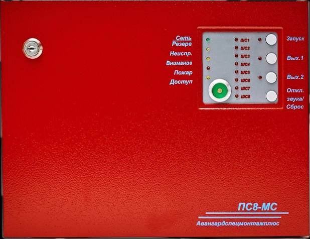Прибор приемно-контрольный пожарный и управления «ПС8-МС» предназначен для организации систем пожарной сигнализации, управления устройствами оповещения и эвакуации, а также формирования команды на запуск систем речевого оповещения. Прибор контролирует 8 шлейфов пожарной сигнализации и оснащен двумя выходами управления устройствами оповещения с контролем на обрыв и замыкание, каждый из которых рассчитан на максимальный ток 2 А. Также имеются один выход состояния «Неисправность», один выход состояния «Пожар» и три программируемых релейных выхода для управления технологическим оборудованием. Питание прибора осуществляется от сети 220 В, 50±0,5 Гц, с максимальной потребляемой мощностью не более 70 Вт. При пропадании сетевого напряжения прибор автоматически переключается на питание от встроенного аккумулятора, осуществляет его автоматическую зарядку и контролирует его состояние, обеспечивая защиту от замыканий и переполюсовки. При разряде АКБ до напряжения 10,5±0,2 В прибор переходит в «спящий» режим с контролем напряжений каждые 2 секунды. Потребляемый ток от внутреннего источника питания в дежурном режиме не превышает 75 мА, а в режиме «Пожар» — 200 мА. Прибор имеет встроенный звуковой сигнализатор. Габаритные размеры прибора не превышают 330×255×105 мм, с отсеком для аккумуляторной батареи размером 185×185×85 мм (емкость АКБ до 20 А/ч, 12 В). Масса прибора не более 2,8 кг. Диапазон рабочих температур: от 0°С до +40°С. Срок службы — не менее 10 лет, вероятность отказа за 1000 часов работы — не более 0,01. Степень защиты оболочки — IP30, класс устойчивости к электромагнитным помехам — 2, группа исполнения по устойчивости к механическим воздействиям — LX.