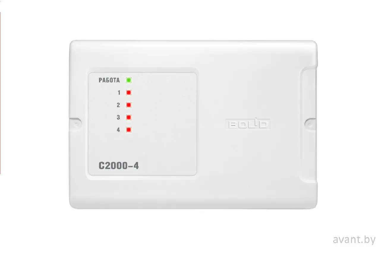Блок приемно-контрольный охранно-пожарный С2000-4 предназначен для контроля четырех радиальных неадресных шлейфов сигнализации (ШС). Устройство оснащено световой индикацией, включающей один индикатор состояния блока и четыре индикатора состояния каждого ШС. Энергонезависимый буфер событий рассчитан на 4088 сообщений. Блок имеет встроенный звуковой сигнализатор и датчик вскрытия корпуса (микроконтакт). Связь с системой осуществляется через интерфейс RS-485. Питание блока осуществляется от внешнего источника постоянного тока напряжением 10,2–28,4 В через два ввода. Потребляемый ток составляет 110–260 мА при напряжении 12 В и 60–140 мА при напряжении 24 В. Время готовности к работе после включения питания не превышает 3 секунд. Блок поддерживает подключение внешнего считывателя электронных идентификаторов с интерфейсами Touch Memory, Wiegand и ABA TRACK II. Управление считывателем включает контроль двух светодиодов (зеленый и красный) с сигналом +5В КМОП и ограничением тока до 10 мА, а также управление звуковым сигнализатором. Объем памяти для хранения ключей Touch Memory или Proximity-карт составляет 4096. Устройство имеет четыре выхода: два электромагнитных реле (30 В, 7 А, 100 Вт постоянного тока) и два ключа (транзисторных) на 12/24 В с током до 1 А, контролем цепей нагрузки (ток контроля 1,0 мА) и защитой от перегрузки. Блок работает в диапазоне температур от -40 до +50 °C при относительной влажности до 98% (при +25 °C). Степень защиты корпуса — IP40. Габаритные размеры — 156×107×39 мм, вес — не более 0,3 кг. Средний срок службы — 10 лет. Программирование выполняется программой UProg.exe через интерфейс RS-485 с преобразователем интерфейсов. Тип монтажа — настенный навесной или на DIN-рейку.
