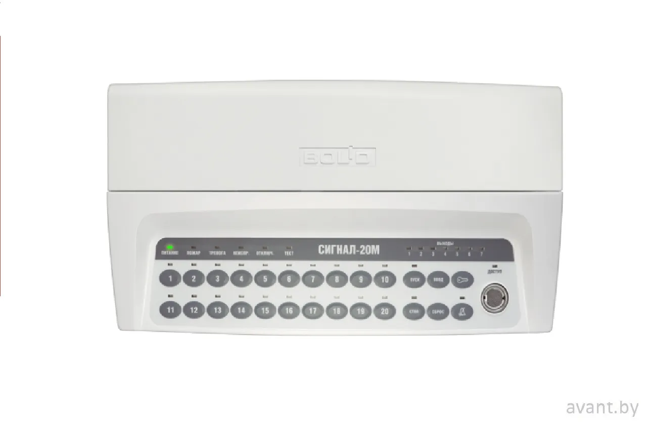 Прибор приемно-контрольный и управления охранно-пожарный Сигнал-20М предназначен для работы в качестве совмещенного приемно-контрольного прибора и прибора управления средствами оповещения в составе комплексов пожарной сигнализации и автоматики, систем оповещения и управления эвакуацией 1 и 2 типов, охранной, тревожной и технологической сигнализации. Прибор способен работать автономно или как адресное устройство в составе ИСО "Орион" под управлением пульта "С2000М" или ПК с АРМ "Орион Про". При работе с пультом "С2000М" вер.3.00 и выше обеспечивает подключение противопожарного оборудования. Прибор имеет два входа питания. Время технической готовности к работе составляет 5 секунд. Устройство поддерживает 20 входов для подключения шлейфов сигнализации. Напряжение на клеммах ненагруженного входа — 26,5–27,5 В. Номинальный ток нагрузки контролируемого выхода — от 5 до 2500 мА. Сопротивление оконечного резистора выхода — 4,7±5% кОм. Напряжение на выключенном выходе при подключенном резисторе — от -1100 до -2200 мВ. Ток контроля исправности линий выхода не превышает -1,5 мА. Степень защиты оболочки — IP40 по ГОСТ 14254-2015. Устройство устойчиво к вибрационным нагрузкам в диапазоне частот 1–35 Гц с максимальным ускорением 0,5g и соответствует категории размещения 3 по ОСТ 25 1099-83. Климатическое исполнение — О3. Прибор работает в диапазоне температур от –30 до +55 °C при относительной влажности до 98% (при +25 °C). Масса прибора — 0,5 кг, габаритные размеры — 332×177×42 мм. Наработка на отказ в дежурном режиме — не менее 80000 часов, вероятность безотказной работы — 0,98758, средний срок службы — 10 лет.