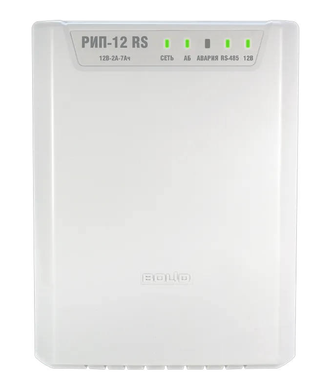12В, 2А (мах 3А); емкость АБ 7Ач; световая индикация; звуковая сигнализация; датчик вскрытия корпуса; защита: от перенапряжения, от КЗ, от переполюсовки АБ; интерфейс RS-485; пластиковый корпус, не поддерживающий горение.