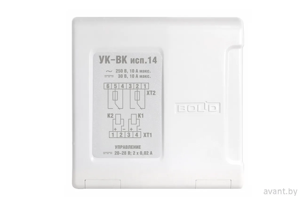 УК-ВК исп.14 - Устройство коммутационное. Релейный усилитель на 2 реле (Н.З., на переключение), Uвх=24В/15мА, Uком макс= 250В/10А перем ток или 30В/10А пост. ток, IP30, -30°С...+50°С