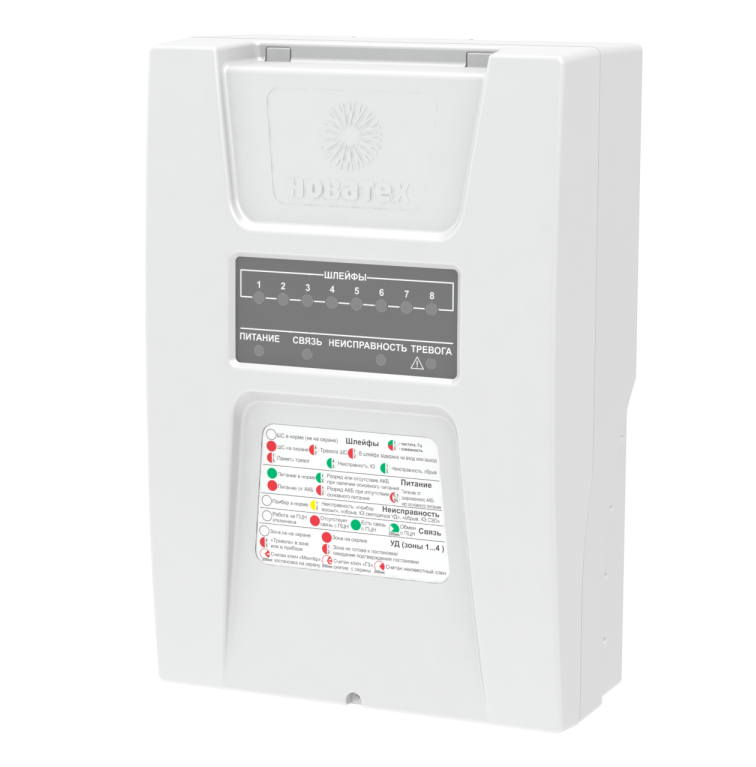 Прибор приемно-контрольный охранный ПКО-8Е предназначен для контроля состояния шлейфов охранной и тревожной сигнализации с индикацией состояния на лицевой панели и управления светозвуковыми оповещателями и/или пультами централизованного наблюдения. Питание прибора осуществляется от сети переменного тока номинальным напряжением 220 В частотой 50 Гц с допустимым отклонением от -15% до +10%. Ток потребления от сети без внешней нагрузки не превышает 40 мА, а потребляемая мощность — 40 В·А. Для резервного питания используется аккумуляторная батарея 12 В емкостью 7 А·ч. Средний ток потребления прибора от АКБ без внешней нагрузки не более 130 мА, время работы в дежурном режиме от аккумулятора — не менее 24 часов. Ток заряда АКБ при разряде до 10 В не превышает 0,6 А, режим заряда — управляемый. Прибор поддерживает до 8 шлейфов сигнализации с программируемым временем реакции 70 или 750 мс. Параметры шлейфов включают оконечный резистор 1,5±5% кОм, дополнительный резистор охранного извещателя 2,7±5% кОм, сопротивление шлейфа не более 330 Ом и сопротивление изоляции не менее 20 кОм. Связь с пультом централизованного наблюдения осуществляется через интерфейс Ethernet 10Base-T/100Base-TX (10/100 Мбит/с). Максимальное число ключей доступа в энергонезависимой памяти прибора: 32 для ответственных лиц («Хозяин»), 15 для группы задержания («ГЗ») и 15 для электромонтеров («Монтер»). Прибор оснащен двумя выходами питания внешних устройств: выход 1 на 12 В с максимальным током 1 А и выход 2 на 12 В с током 0,35 А, а также выходом питания светозвукового оповещателя на 12 В с током 0,1 А. Имеется одна кнопка «Подтверждение снятия» с максимальным расстоянием от прибора 50 м. Поддерживается подключение до 4 устройств доступа с суммарным расстоянием до 100 м. Встроенный программируемый зуммер обеспечивает уровень громкости не менее 60 дБ. Прибор работает в диапазоне температур от +5 до +40 °C при относительной влажности до 95% (без конденсации влаги). Степень защиты оболочки — IP30. Габаритные размеры не превышают 250×170×87 мм, масса без АКБ — не более 1 кг.