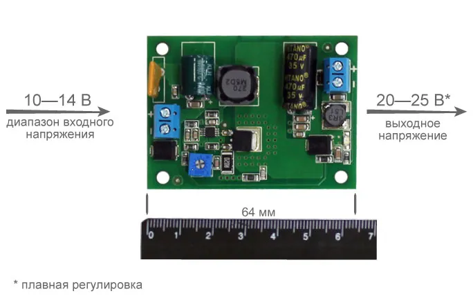 ПН-12/24-1,0 (встраиваемый модуль на печатной плате размером 52х64x30 мм) преобразует нестабилизированное входное напряжение от 10 до 14 В постоянного тока в выходное стабилизированное напряжение 24 В постоянного тока для питания нагрузки с током потребления до 1 А.