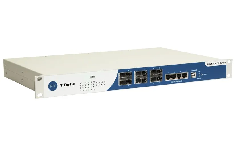 Коммутатор предназначен для подключения уличных коммутаторов TFortis PSW по оптоволоконному кабелю. 4 порта 10/100/1000Base-T RJ-45; 12 портов 1000Base-X SFP; STP (802.1d)/RSTP(802.1w); IGMP Snooping v2; VLAN (802.1q); Flow Control (802.3x); Quality of Service(QoS, 802.1p); SNMP Traps; Syslog; Системный журнал; Web-интерфейс; Telnet; SNMP v1; Наработка на отказ не менее 50 000 часов (5,7 лет); Напряжение питания: ~ 220В (от 187В до 246В); Макс. потребляемая мощность: не более 20Вт; Рабочая температура: от +5 до +40°С; Масса: не более 3 кг; Размеры: 19’’ 1U.