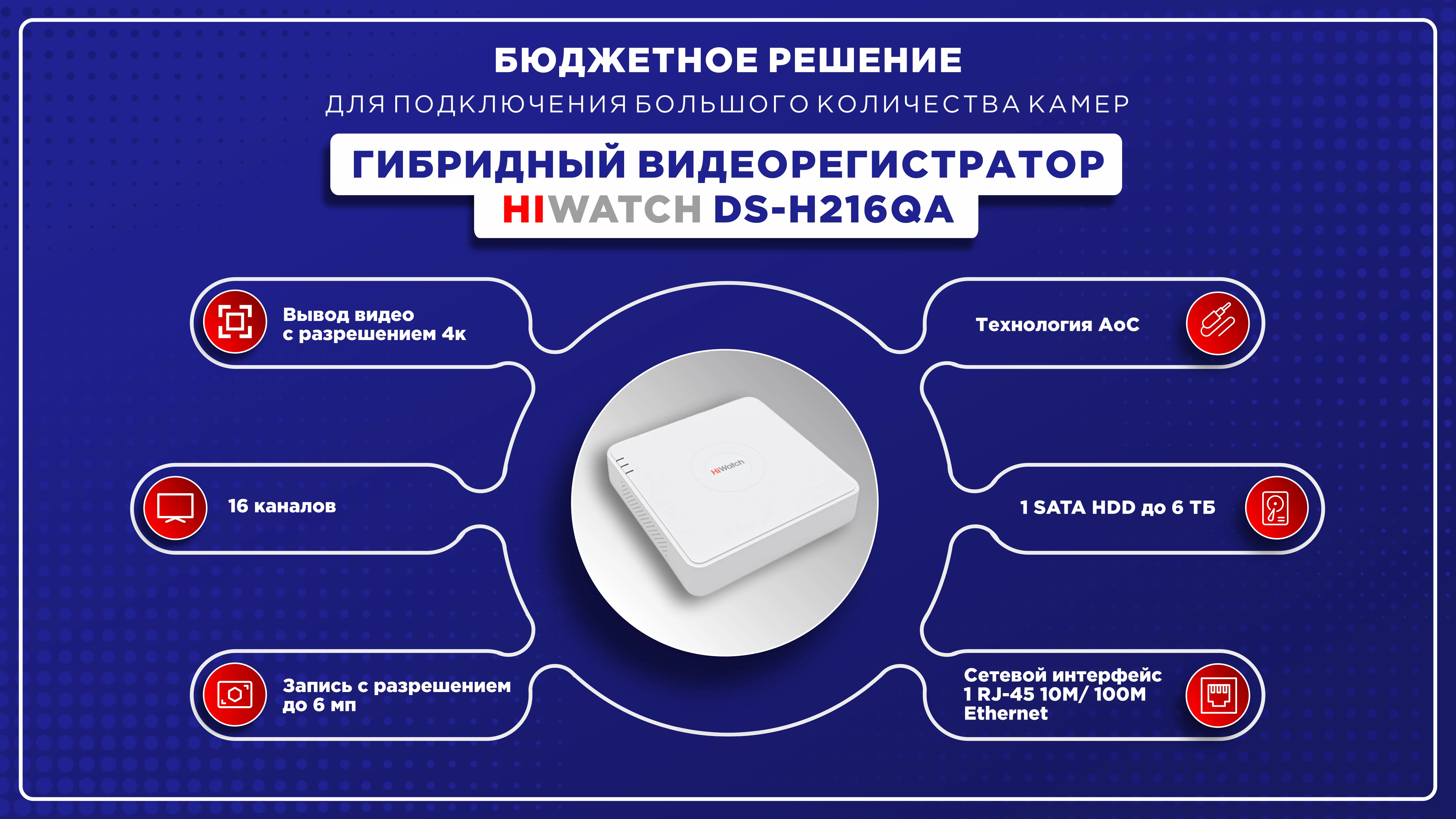 16-ти канальный гибридный HD-TVI AOC регистратор для аналоговых, HD-TVI, AHD и CVI камер + 2 IP-канала (возможно расширение до 24 IР-камер с замещением в расширенном режиме IP); Видеовход: 16 каналов BNC; Аудиовход: 1 канал RCA; Видеовыход: 1 VGA до 2К, 1 HDMI до 4К; Аудиовыход; 1 канал RCA; видеосжатие H.265/H.265+/H.264/H.264+; аудиосжатие G.711u. Разрешение записи на канал: TVI: 3МР@15к/с (первые 4 канала), 1080p@15к/с, 1080p Lite /720p Lite /720p@25к/с; AHD и CVI: 1080p@15к/с, 1080p Lite/720p@25к/с; аналоговые камеры WD1@25к/с; IP: доп. 2 канала до 4МР. 1 SATA для HDD до 6Тб; 1 RJ-45 10M/100M /1000M Ethernet интерфейс; 2 USB2.0; -10°C до +55°C; 12В DC; 15Вт макс (без HDD).