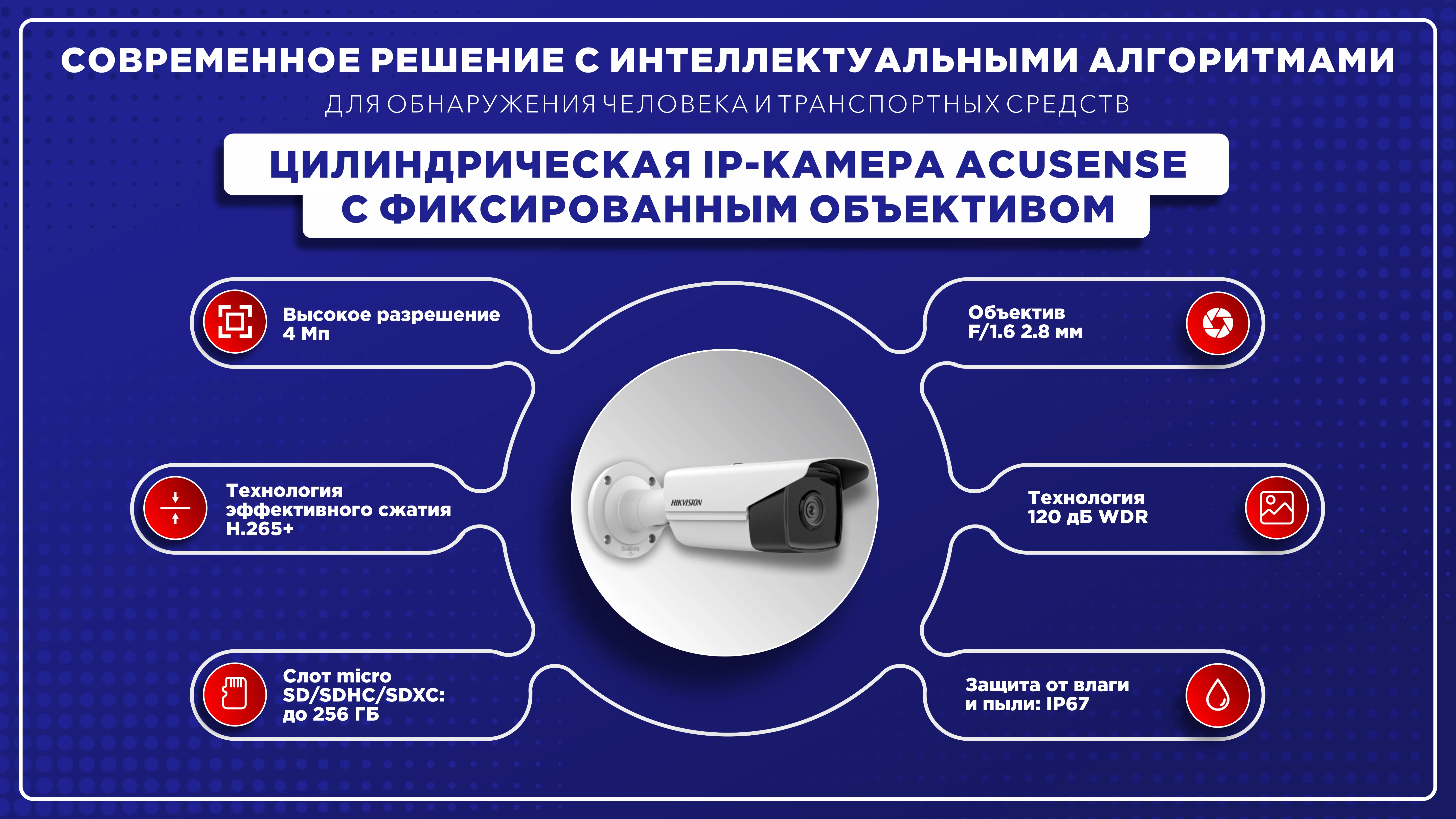 4MP уличная цилиндрическая AcuSense IP-камера , ИК подсветкой 80 м Матрица: 1/3’’ Progressive Scan CMOS; Чувствительность: Цв. 0.005лк@(F1,6,AGC вкл.), 0лк с ИК;Угол обзора объектива: по горизонтали:84°, по вертикали:45°, по диагонали:100°,Видеосжатие: H.265/H.264/H.264+/H.265+; Максимальное разрешение: (2688 × 1520), 30 к/с; BLC/HLC/3D DNRC; ONVIF(PROFILE S,PROFILE G), ISAPI; Сетевой интерфейс: 1 RJ45 10M/100M Ethernet; Питание: DC12В ± 25%/PoE(802.3af); Потребляемая мощность: 12,5 Вт макс.; Рабочие условия: -30 °C…+60 °C, влажность 95% или меньше (без конденсата); Защита: IP67; Материал корпуса: Металл ; Размеры: Ø105 × 293мм; Вес: 1,07 кг.