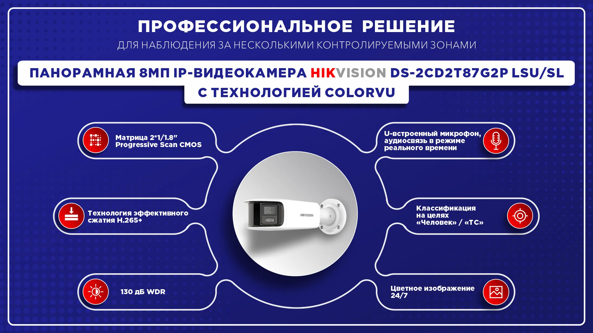 8MP уличная цилиндрическая панорамная AcuSense ColorVu IP-камера c двумя модулями, с ИК подсветкой 30 м Матрица- 2 × 1/1.8" Progressive Scan CMOS ; Чувствительность- цвет:0.0005 лк@(F1.0, AGC ВКЛ), Угол обзора объектива: по горизонтали: 180°, по вертикали: 44°, Видеосжатие: H.265/H.264/H.264+/H.265+; Разрешение: 5120 × 1440 @ 12,5 к/с; BLC, HLC, 3D DNR, ONVIF(PROFILE S,PROFILE G), ISAPI; Сетевой интерфейс: 1 RJ45 10M/100M Ethernet; Питание: DC12В ± 25%/PoE(802.3af); Потребляемая мощность: 10,5 Вт макс.; Рабочие условия: -30 °C…+60 °C, влажность 95% или меньше (без конденсата); Защита: IP67; Материал корпуса: Металл .