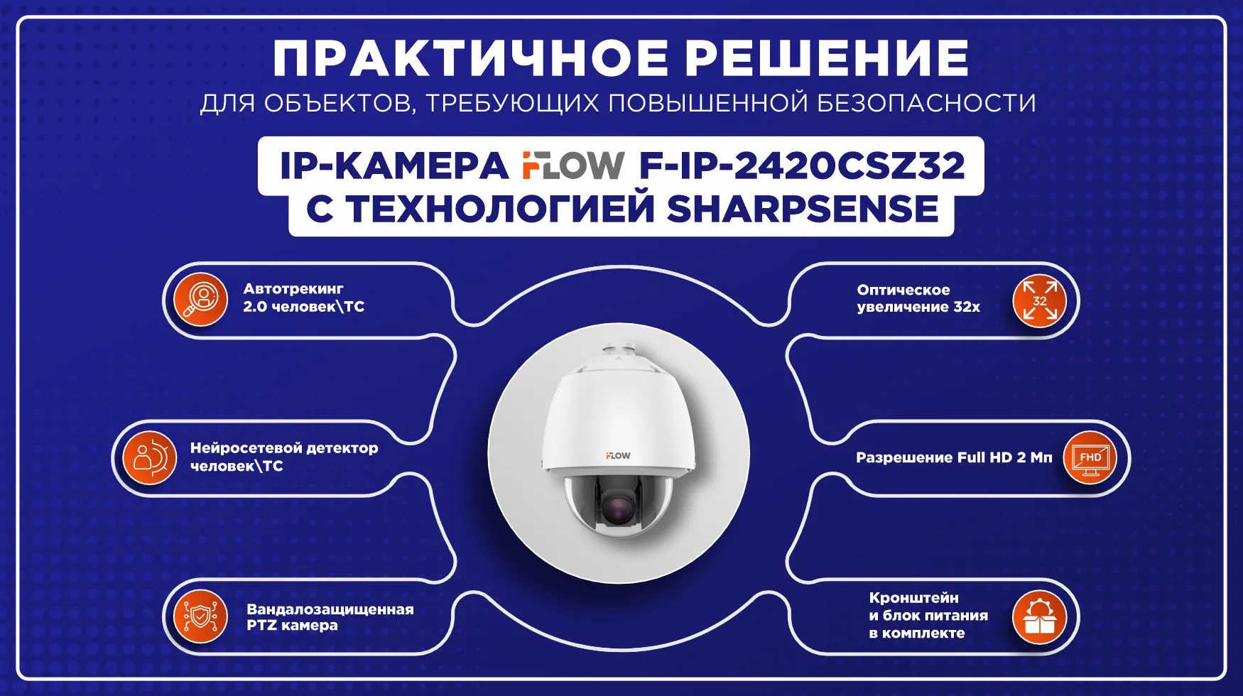 2МП уличная поворотная IP-видеокамера с технологией SharpSense оснащена 1/2.8" Progressive Scan CMOS и объективом с фокусным расстоянием 4.8 - 153,6 мм, обеспечивающим 32-кратное увеличение и угол обзора от 50.8° до 2.6°. Камера имеет механический ИК-фильтр и минимальную освещенность 0.005 лк@F1.6. Поддерживает видеосжатие H.265/H.264/MJPEG/H.265+/H.264+ с тройным потоком и разрешением 1920x1080 при 25 к/с. Устройство оснащено WDR 120 дБ, 3D DNR, BLC, антитуманом, ROI и EIS. Функции безопасности включают обнаружение движения, вторжение в область, пересечение линии, а также классификацию объектов на «человек» и «транспортное средство». Камера поддерживает аудиодетектор и захват лиц. Вращение на 360° осуществляется вручную со скоростью 0.1° - 250°/с или по предустановке до 300°/с; наклон составляет -5° - 90° (вручную: 0.1° - 150°, по предустановке: 200°/с). Возможны 300 предустановок, слот для microSD поддерживает карты до 256 Гб. Имеются аудиовход/выход 1/1 и тревожные вход/выход 2/1. Подключение осуществляется через RJ45 10M/100M Ethernet, питание — AC24В или PoE (802.3at) с максимальным потреблением 20Вт. Блок питания входит в комплект, рабочая температура камеры составляет от -40°C до +65°C. Защита от перенапряжений TVS, степень защиты IK10, вес устройства — 3 кг, настенный кронштейн также включен в комплект.